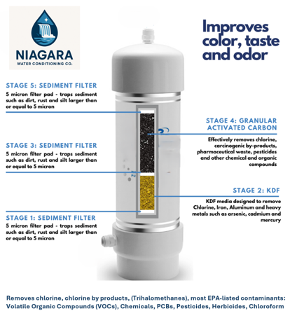 An activated carbon filter that is installed at the water source to reduce chlorine, chloramines, and unwanted tastes or odors, ensuring fresher, cleaner water throughout the home.